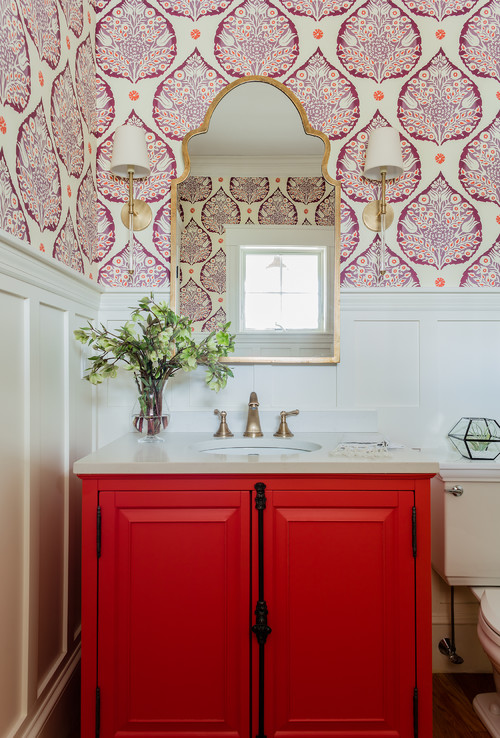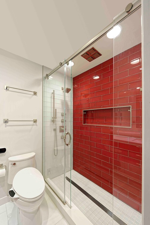 Banyo dekorasyonunda kırmızı renk parlak seramikler, kırmızı renk dolap kapakları, kırmızı renk kapı ve ayna çerçevesi düşünebilirsiniz.