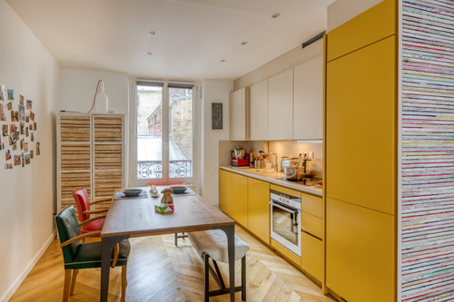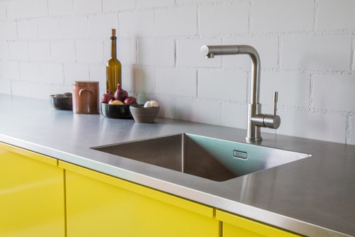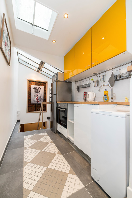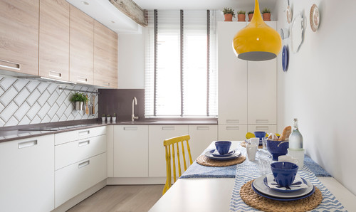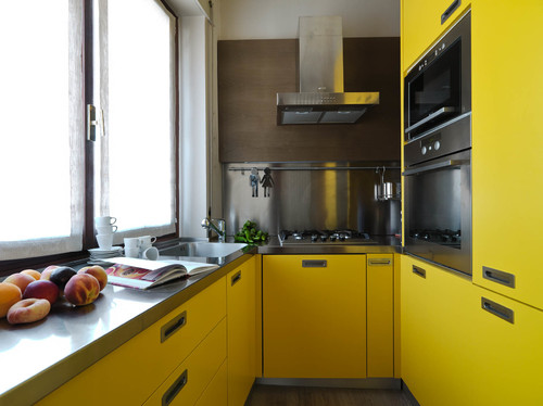 Canlı bir mutfakta, keyifli vakit geçirmek için cıvıl cıvıl ortaya çıkan sarı mutfak dolapları kullanabilirsiniz.