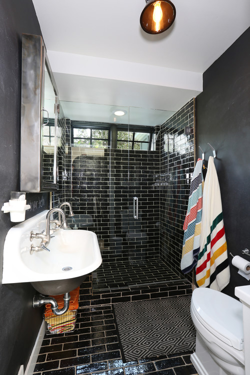 Siyah banyo modelleri klasik çizgilerden uzaktır. Kırmızı, sarı, altın, beyaz, gri renkleri ile güzel uyum sağlayacaktır. Siyah döşenmiş bir banyoda ufak tefek kırmızı, sarı, altın rengi detaylı aksesuarlar, banyoyu havalı bir hale getirecektir.
