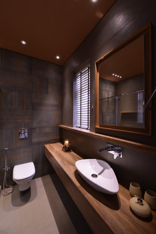 Görüldüğü gibi artık nesneler sadece belirli alanlarda değil, her alanda aktif bir şekilde rol alıyor. Daha az aksesuar kullanarak banyoyu ferah ve büyük göstermek için duvarlarda yine siyaha uygun aynalar asılabilir.
